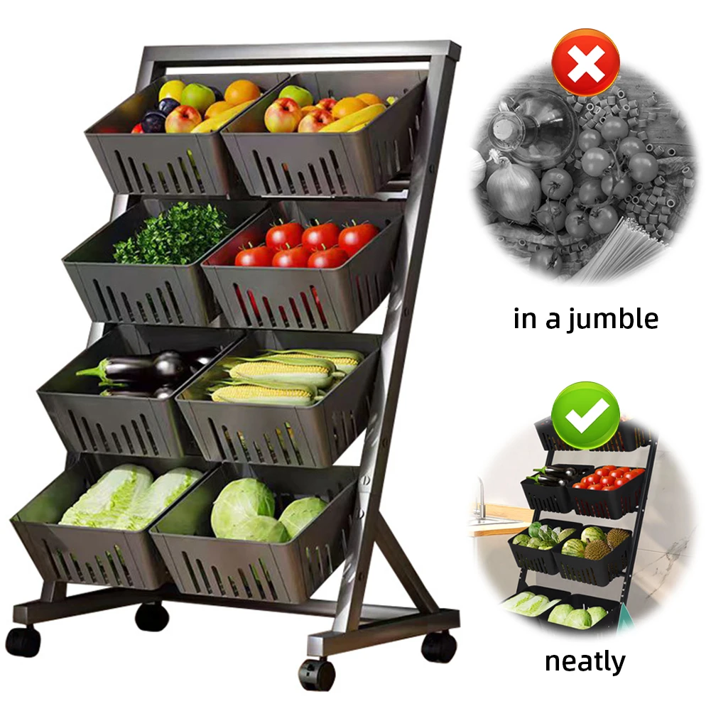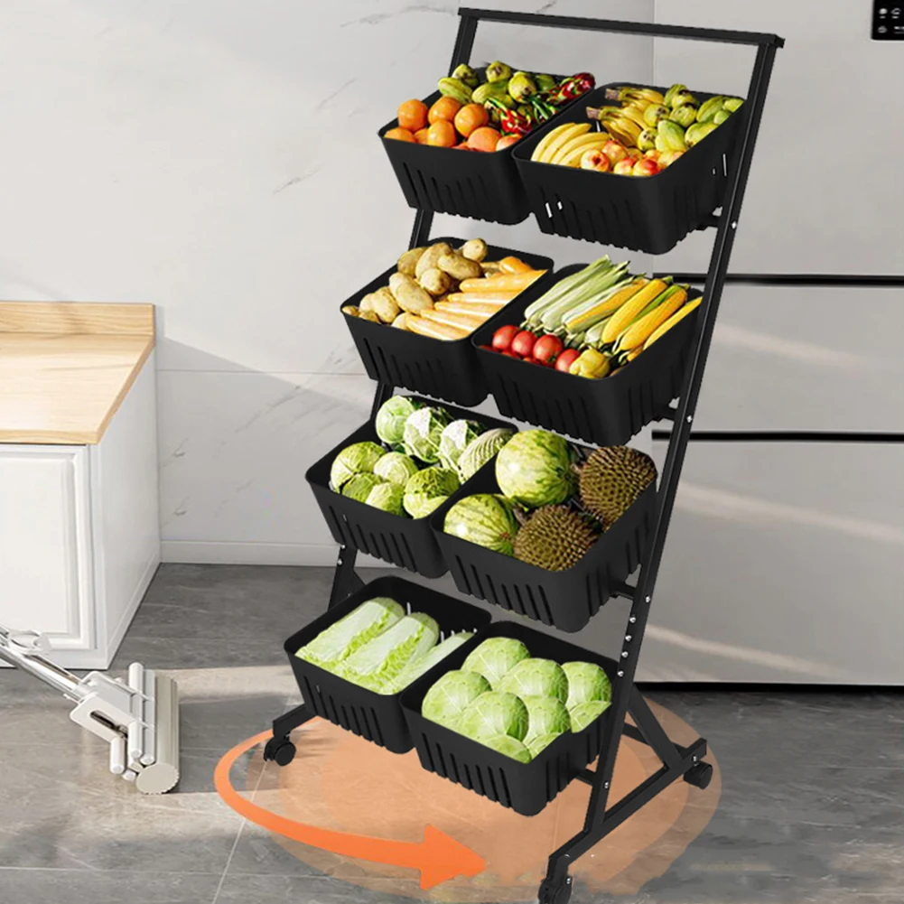 4. 360° Mobile Wheel : This vegetable storage rack features four wheels with built-in brakes to secure it in place. The 360° rotating design of the wheels allows for easy movement, making it effortless to clean the corners where the cart is placed.