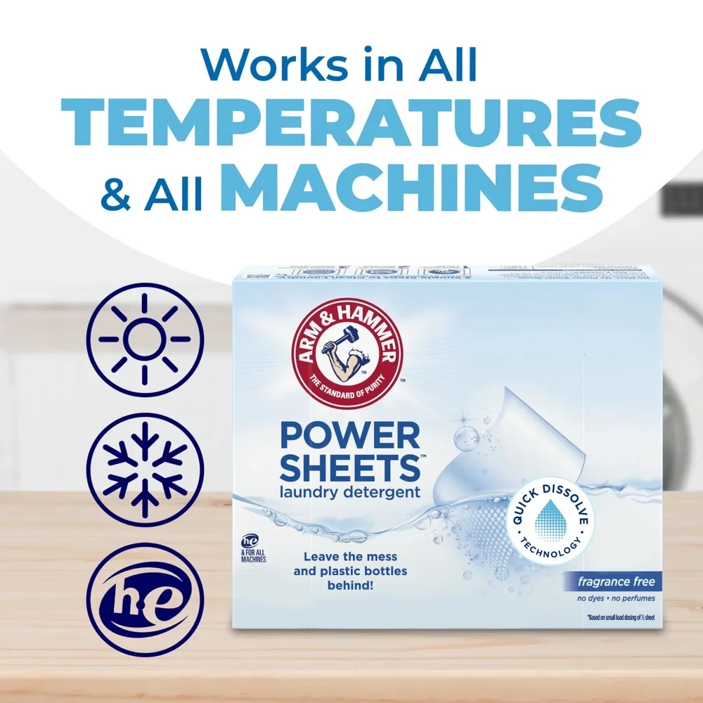 These concentrated HE laundry detergent sheets use Quick Dissolve Technology to dissolve quickly and fully in all wash temps, even cold water